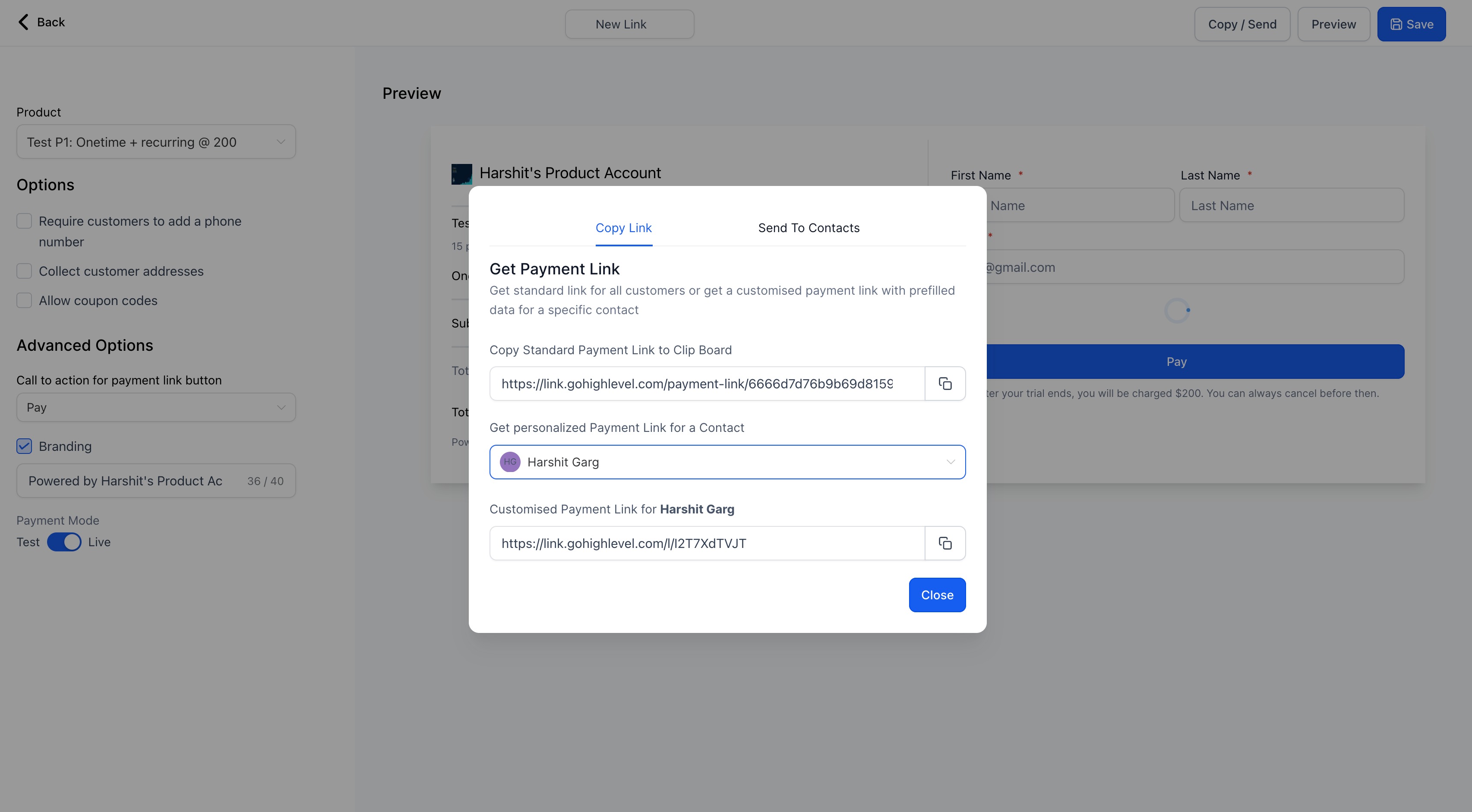 3. Along with this the business user also has an option to copy the standard link or choose a contact from the dropdown and get personalized payment link for the contact.