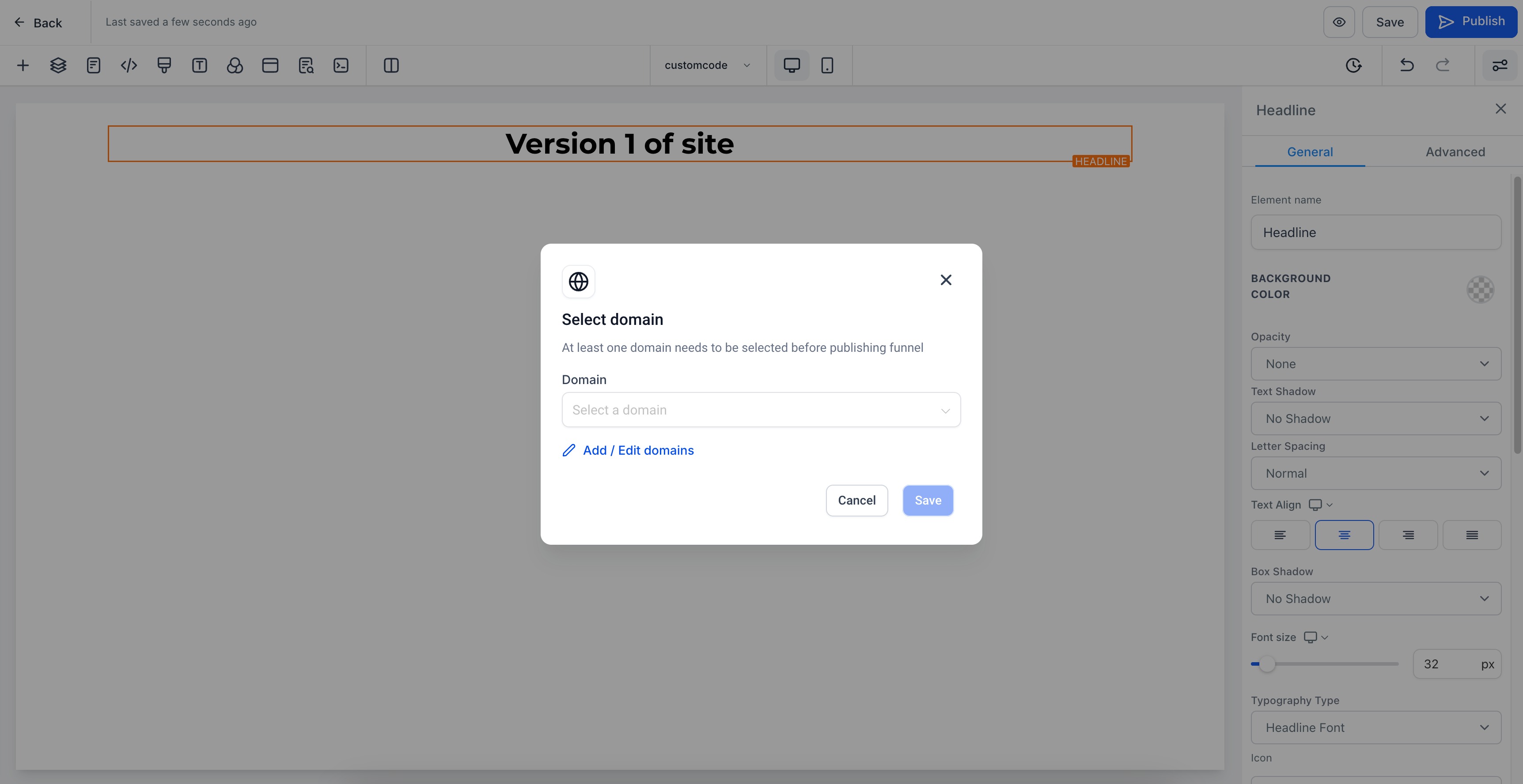 If a funnel is not connected to any domain, on clicking publish, you will be prompted to attach a domain in the newly introduced domain attach popup in the builder. Once the domain is connected, the version will be published.
