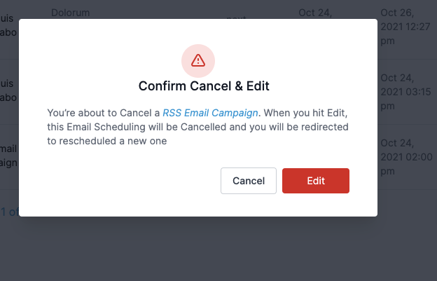- Edit: If you click the pencil icon to edit, you will see a confirmation modal asking you to confirm that you would like to cancel the currently scheduled email and re-schedule a new one.