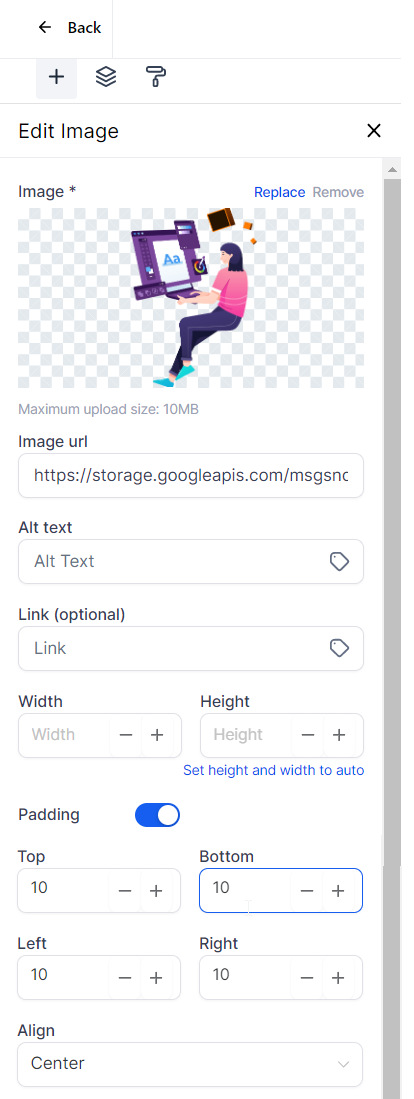Padding: Control the space around your image by adjusting the padding. Set the padding for the top, bottom, left, and right sides according to your design preferences.