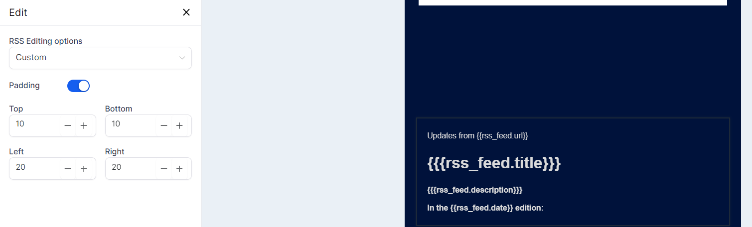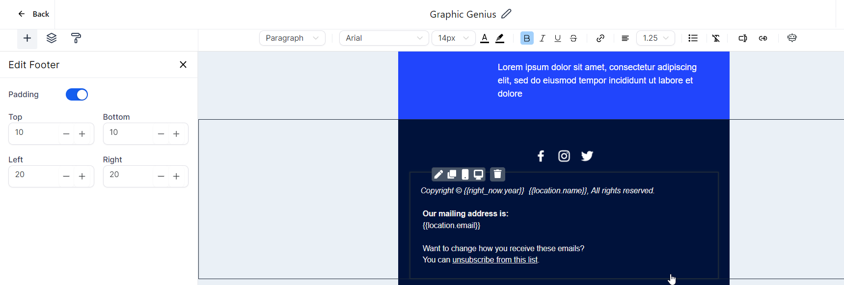 For the purpose of maintaining uniformity in the structure of your emails, we have implemented a default padding update. You now have the ability to manage the spacing around your content. Please be aware that the default settings for padding are as follows: