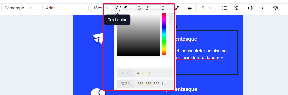 Flexible Color Options: Adding color through hex codes provides precise control over text and highlight colors. For instance, if your brand color is #AFAFAF, you can ensure this exact color is used in your email text or highlights.