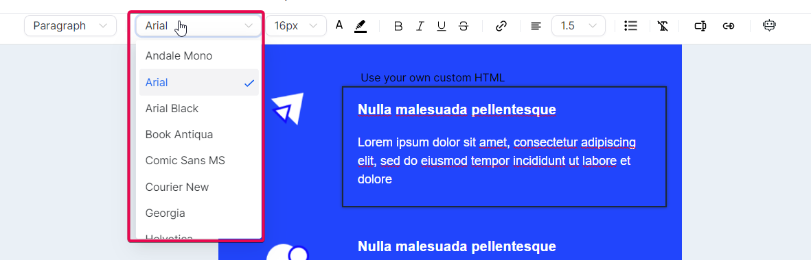 Custom Font Support: With support for various fonts such as Arial, Georgia, Verdana, and more, you can align your email style with your brand aesthetics. For example, if your brand uses Helvetica in its communication, you can use it in your emails for consistency.