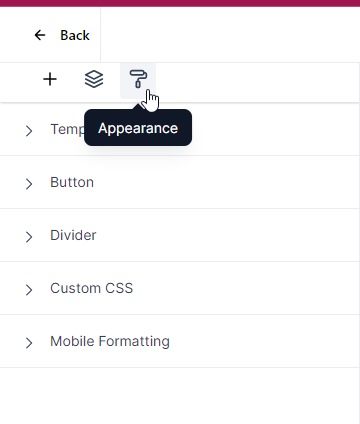 Lastly, the 'Appearance' setting lets you control the global style of your email, including things like background color, Divider, Custom CSS styling, and Mobile Formatting.