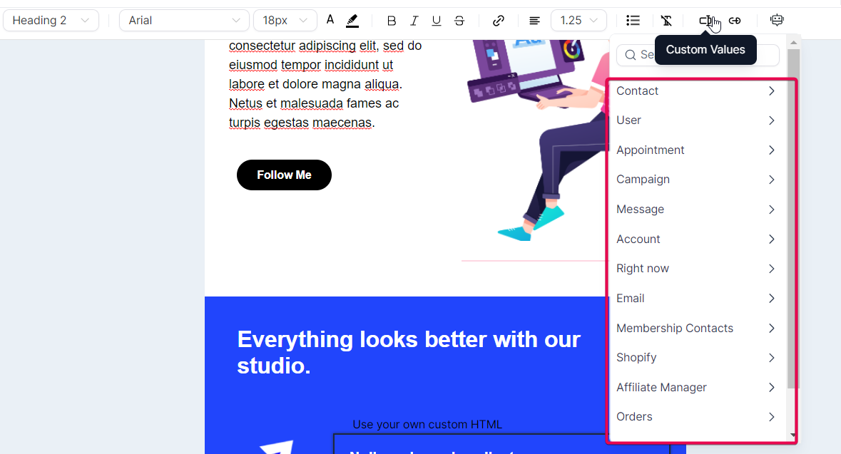 Moreover, the inline editor allows for custom values, giving you better control over your content. The tool also supports AI-assisted content generation, which can help you create engaging email content faster.