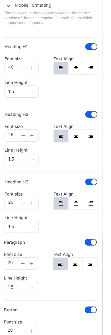 In today's world, it's important that your emails look good on all devices. With that in mind, the Email Builder Inline Editor provides a special section for mobile formatting. Here, you can specify which headings, paragraphs, and buttons should be visible when your email is viewed on a mobile device. This ensures that your emails are optimized for both desktop and mobile viewing.